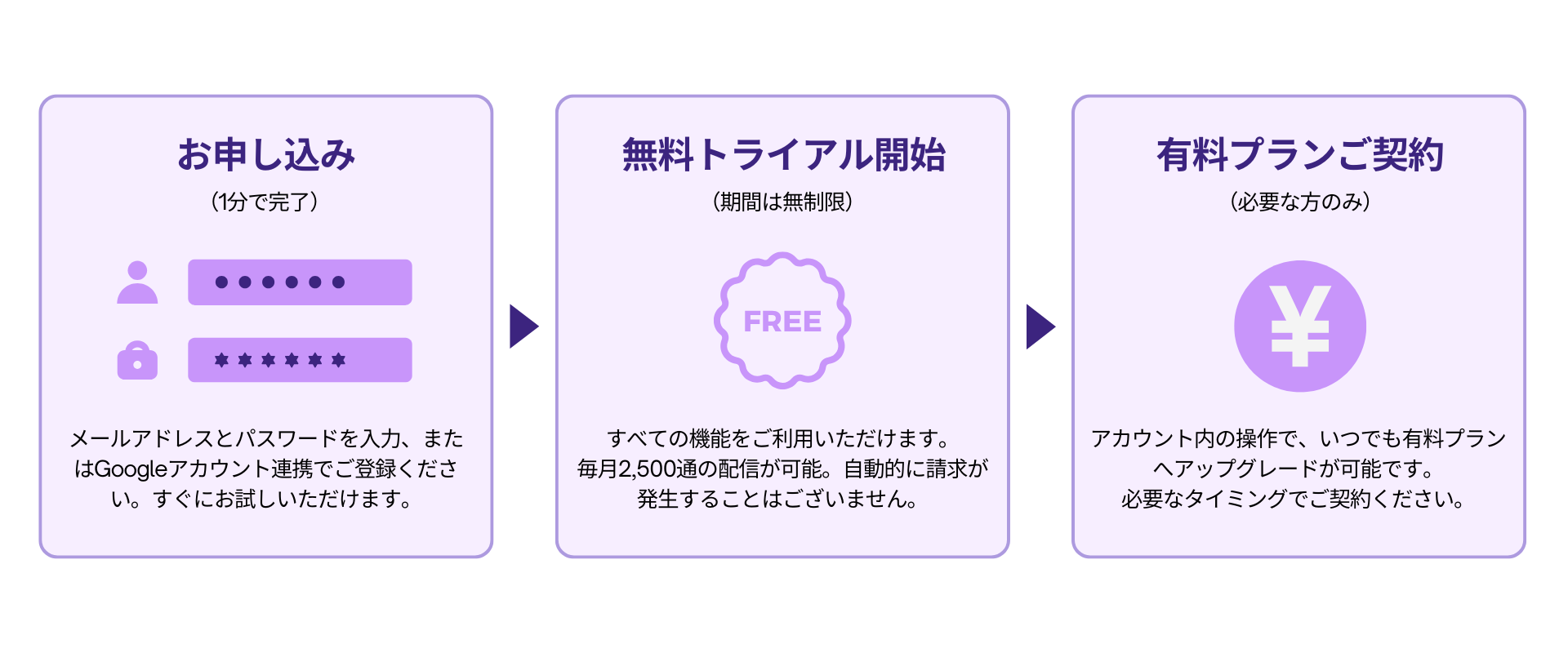 \ まずはお申し込み!月2,500通まで無料で配信・クレジットカード登録不要 /