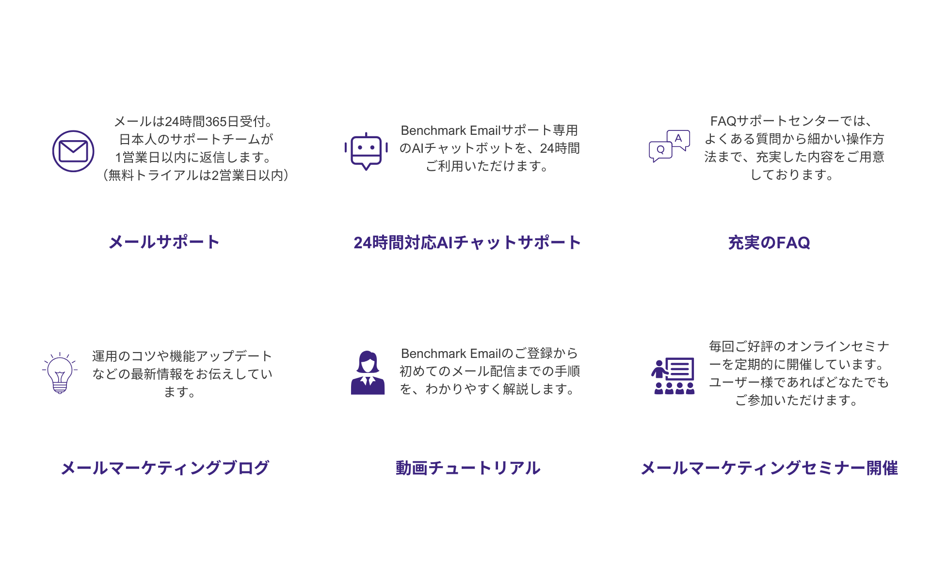 充実したサポートページ・動画チュートリアルのご用意や、各種オンラインセミナーの実施をしております。また、メールでのサポートも承っております。