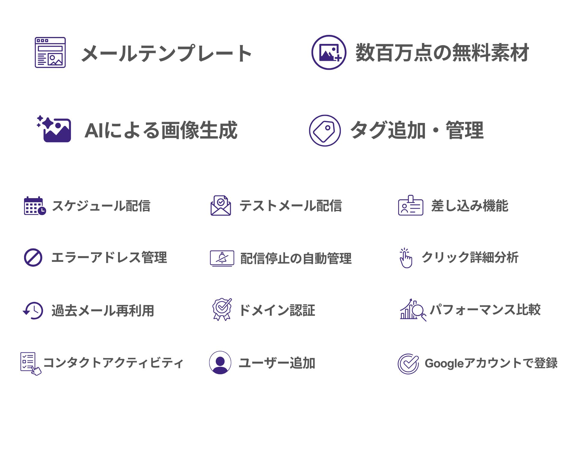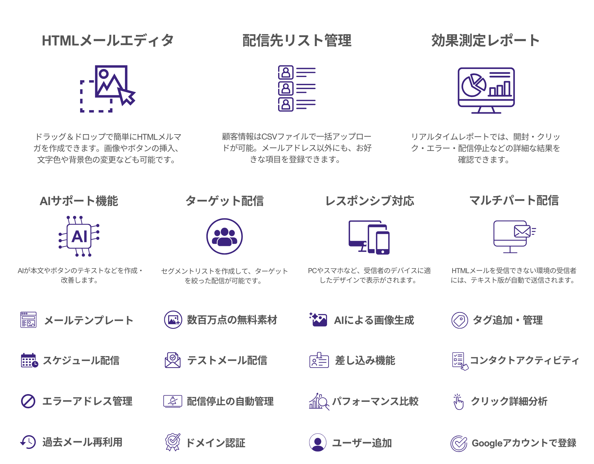HTMLメールエディタ、全テンプレート、リスト管理、レポート機能など、メールマーケティングに必要な機能を無料でお使いいただけます。