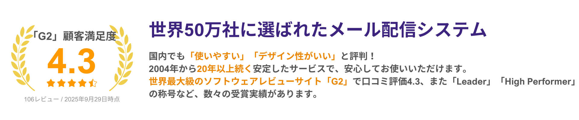 世界最大級のレビューサイト「G2」で口コミ評価4.3、また「Leader」バッジや「High Performer」バッジなど、数々の受賞実績があります。