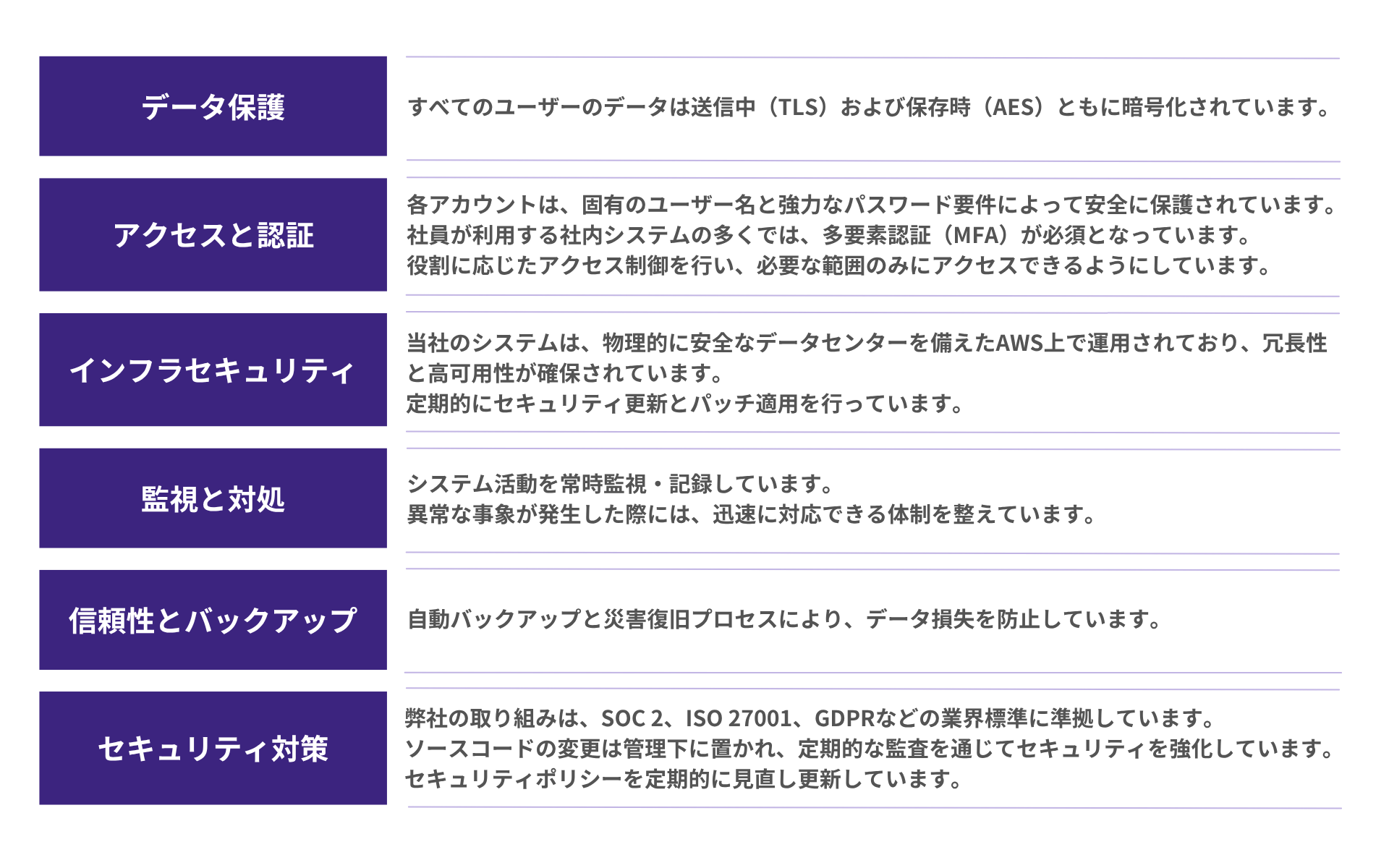 弊社の取り組みは、SOC 2、ISO 27001、GDPRなどの業界標準に準拠しています。